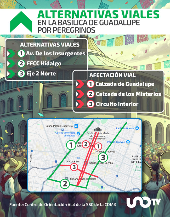 Ante la llegada de miles de peregrinos a la Basílica de Guadalupe, la Secretaría de Seguridad Ciudadana de la Ciudad de México (SSC-CDMX) implementó cortes a la circulación en la Calzada de Guadalupe y en Eje 4 Norte, dentro de la alcaldía Gustavo A. Madero (GAM). Las restricciones buscan garantizar el paso seguro de los contingentes que avanzan desde distintos puntos del país.