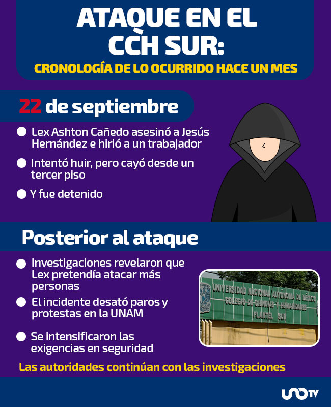 Hace un mes, el 22 de septiembre de 2025, la comunidad del Colegio de Ciencias y Humanidades (CCH) plantel Sur de la UNAM se vio sacudida por un violento ataque que terminó con la vida de un estudiante y dejó a otro trabajador herido.