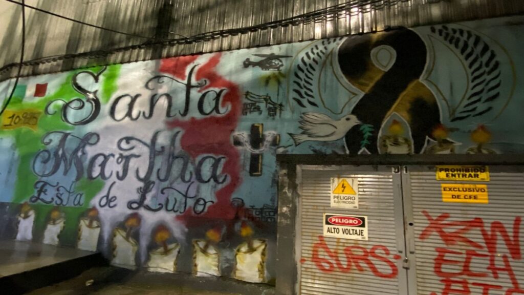 Otro mural cercano, pintado con los colores de la bandera mexicana, lleva la frase “Santa Martha está de luto”. Su fuego pintado simboliza la justicia pendiente para las víctimas.