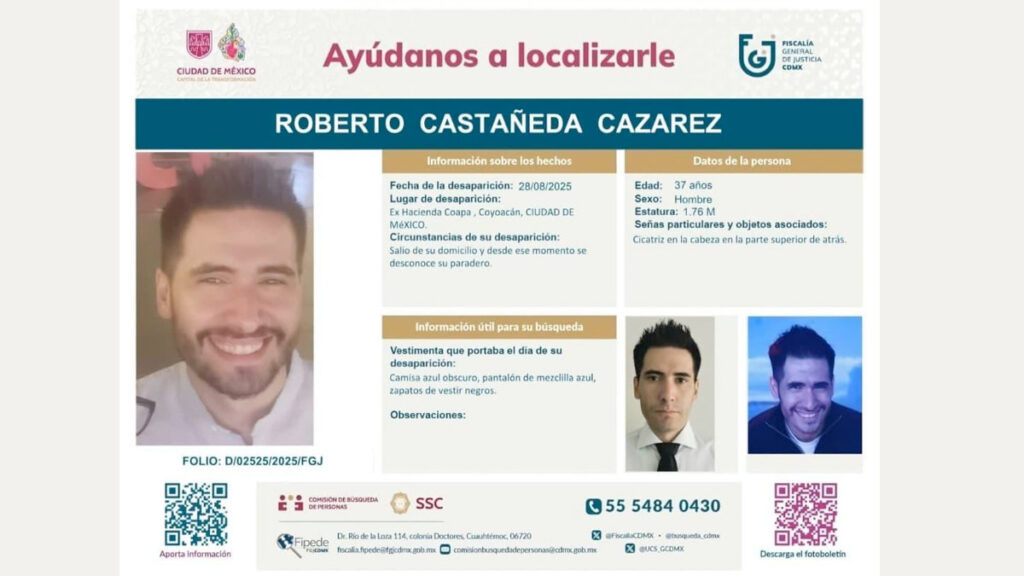 La Fiscalía General de Justicia de la Ciudad de México emitió un ficha de desaparición para localizar a Roberto Castañeda Cazárez, de 37 años, quien fue reportado como desaparecido el pasado 28 de agosto de 2025 en la zona de Ex Hacienda Coapa, en la alcaldía Coyoacán.