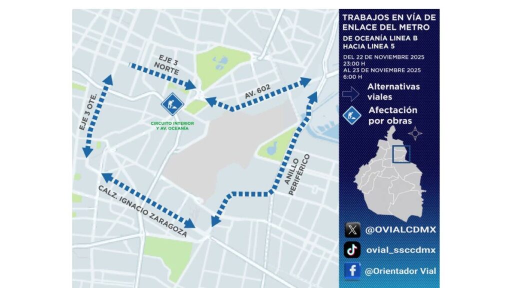 El Sistema de Transporte Colectivo (STC) informó que, debido a trabajos en la vía de enlace de la Línea B, se interrumpirá la circulación en el Circuito Interior a la altura de Avenida Oceanía a partir de las 11:00 de la noche del sábado 22 de noviembre y hasta las 06:00 de la mañana del domingo 23.