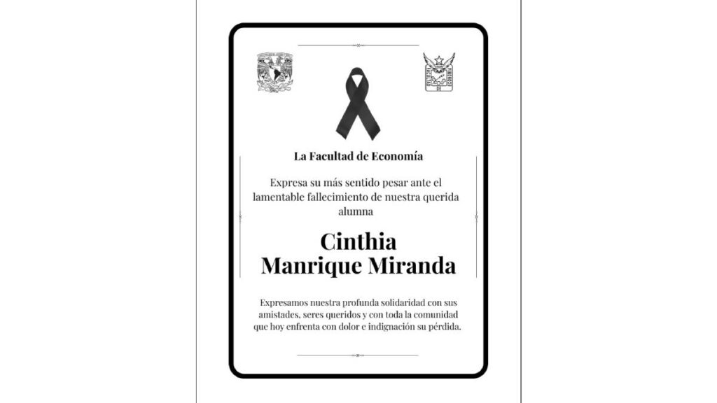 La UNAM condena el feminicidio de Cinthia Manrique Miranda, estudiante de posgrado de la Facultad de Economía. pic.twitter.com/uZDKF4h0GR