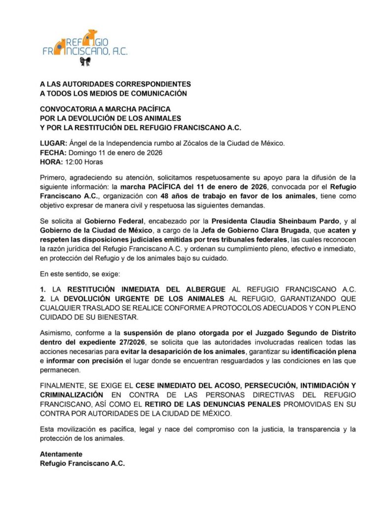 A través de un comunicado compartido en redes sociales, el Refugio Franciscano informó que este domingo organizarían a las 12:00 horas una marcha desde el Ángel de la Independencia, en el Paseo de la Reforma de la CDMX, para exigir la devolución de los animales y la restitución del lugar.
