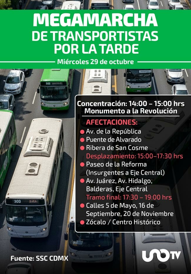 - Concentración (14:00–15:00 hrs): Monumento a la Revolución, afectaciones en Avenida de la República, Puente de Alvarado, Ribera de San Cosme.