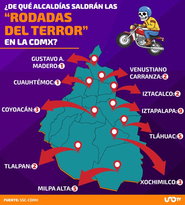 Las “rodadas del terror” tendrán diversos puntos, como el Ángel de la Independencia, inmediaciones del Estadio de Ciudad Universitaria y del Azteca, monumento Cabeza de Juárez y una tienda departamental ubicada en el Circuito Interior, añadió la SSC-CDMX.