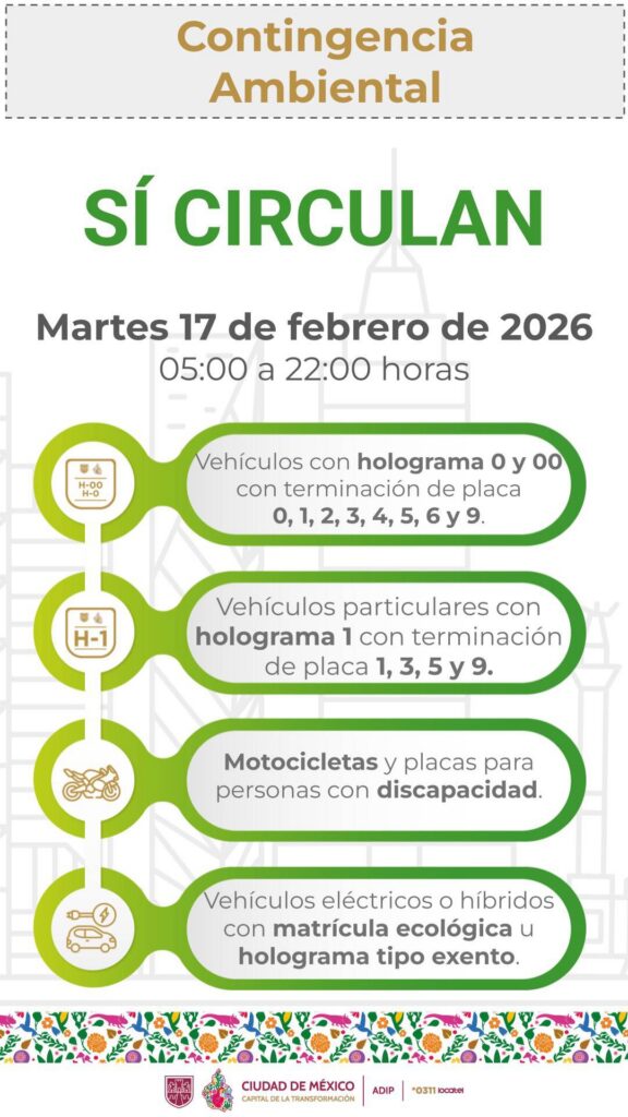 La Comisión Ambiental de la Megalópolis (CAMe) informó la tarde de este lunes que se mantiene la Fase I de contingencia ambiental por ozono en la Zona Metropolitana del Valle de México (ZMVM), con el objetivo de disminuir la exposición de la población a contaminantes y reducir riesgos a la salud. Más tarde, en su reporte de las 20:00 horas, también anunció restricciones adicionales a la circulación para este martes 17 de febrero, conocidas como “doble Hoy No Circula”