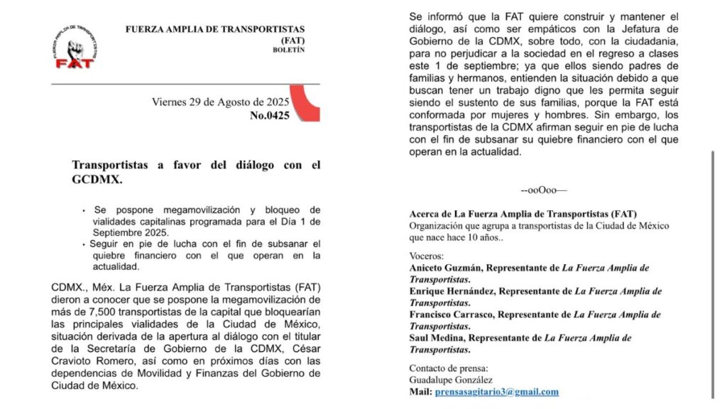 La Fuerza Amplia de Transportistas (FAT) informó que decidió posponer la megamovilización de más de 7 mil 500 concesionarios que estaba programada para este 1 de septiembre en la Ciudad de México (CDMX), luego de que se abriera una mesa de diálogo con autoridades capitalinas.