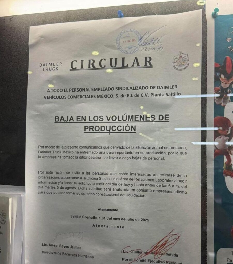 La empresa Daimler Truck anunció este jueves un reajuste de personal en su planta de Saltillo, Coahuila, que implica el recorte de 500 empleos. La medida fue comunicada a los trabajadores sindicalizados mediante un aviso oficial, donde se atribuye la decisión a la “situación actual del mercado y una baja importante de producción”.