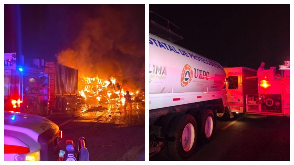 La madrugada de este jueves 23 de octubre, un fuerte choque entre dos tráileres provocó un incendio que bloqueó completamente la autopista Manzanillo-Colima, a la altura del crucero de Loma de Fátima, con dirección hacia la capital del estado. De acuerdo con información de la Unidad Estatal de Protección Civil (UEPC), el accidente se registró alrededor de la 1:30 de la mañana y generó una intensa movilización de cuerpos de emergencia.
