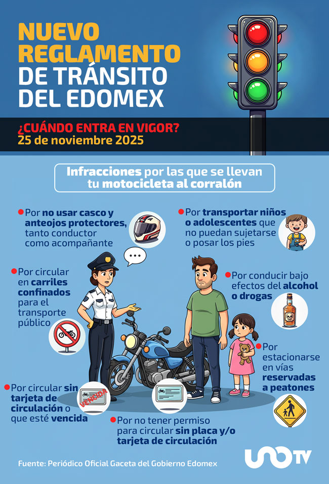 El Nuevo Reglamento de Tránsito del Estado de México (Edomex) entrará en vigor mañana 25 de noviembre como parte del programa estatal “Primero la Seguridad”, que busca reducir incidentes viales, proteger a la población y reforzar el control vehicular. Con estos cambios, se incorporan nuevas sanciones, fotomultas y criterios más estrictos para remitir motocicletas al corralón. Te decimos cuáles son las siete infracciones por las que se pueden llevar tu motocicleta.