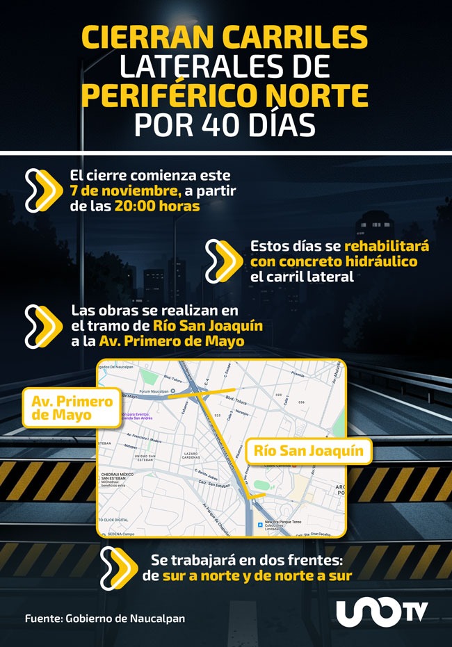 A partir de este viernes 7 de noviembre, a las 20:00 horas, iniciarán los trabajos de rehabilitación con concreto hidráulico en los carriles laterales del Periférico Norte, en el tramo que va de Río San Joaquín a la avenida Primero de Mayo, en el municipio de Naucalpan.