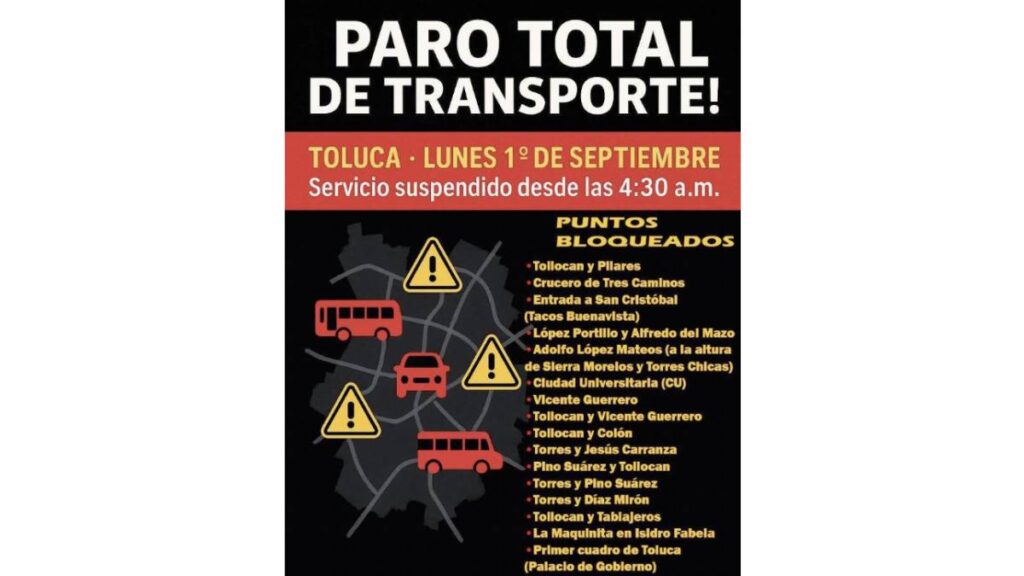 Aunque la megamarcha y bloqueo de vialidades programados para este 1 de septiembre en la Ciudad de México quedaron cancelados, en el Valle de Toluca la medida sigue en pie, por lo que ahí sí habrá paro de transportistas desde las 4:30 am.