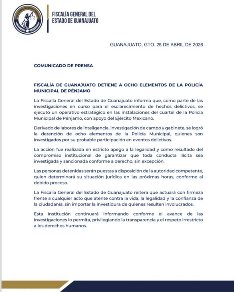 Autoridades del estado de Guanajuato informaron que detuvieron a ocho policías municipales de Pénjamo. Según los reportes oficiales, los elementos de seguridad se encontraban dentro de su cuartel cuando se dieron las detenciones por presuntos vínculos delictivos.