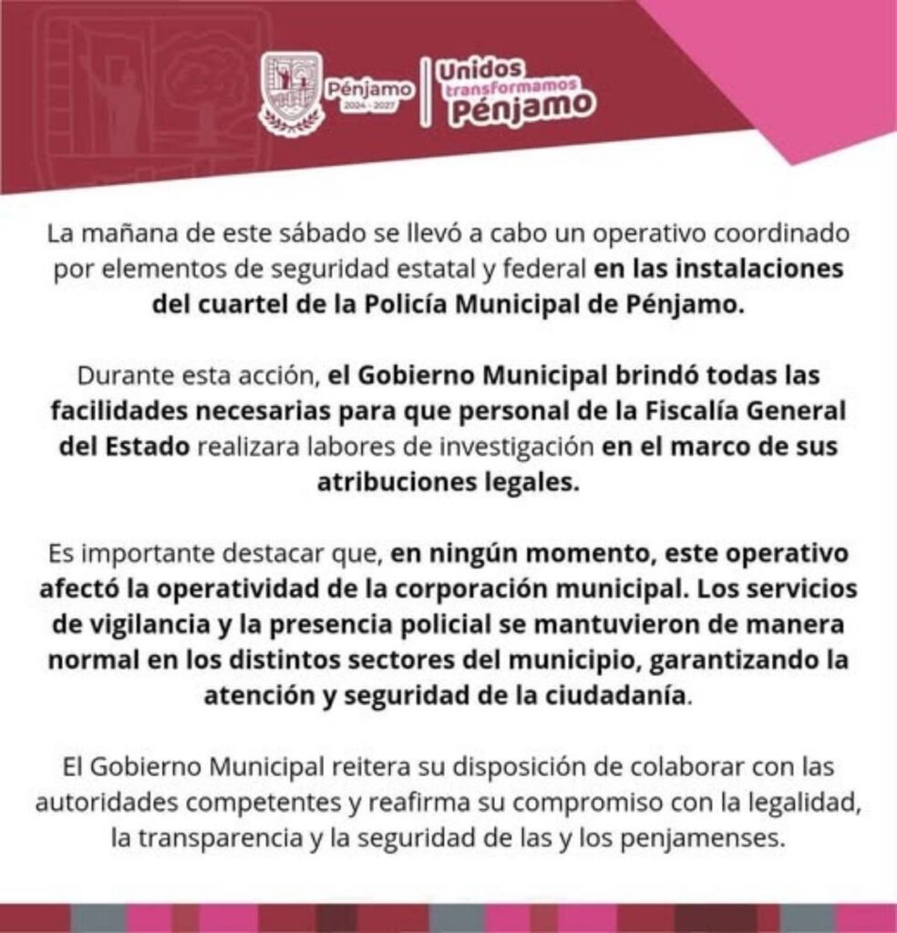 El Gobierno municipal de Pénjamo, a través de un comunicado de prensa, dio a conocer que el pasado sábado 25 de abril, autoridades federales y del estado de Guanajuato realizaron un operativo coordinado en el cuartel de la Policía Municipal.