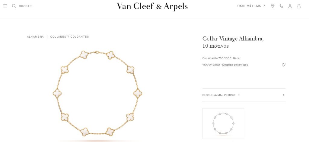 De acuerdo con el sitio oficial de la casa francesa, el accesorio corresponde al modelo Vintage Alhambra de 10 motivos, elaborado en oro amarillo de 750/1000 y nácar natural. Cada pieza contiene 10 piedras únicas, cuyo color y brillo varían de una creación a otra.