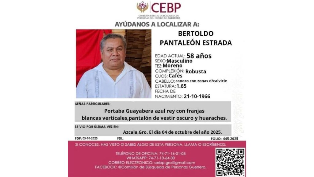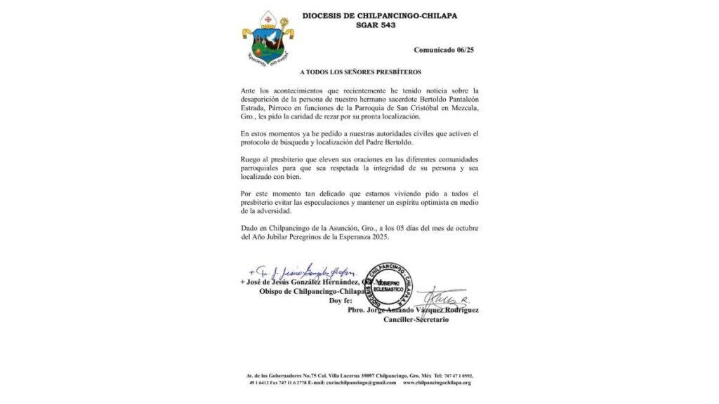 El obispo de la Diócesis Chilpancingo-Chilapa, José de Jesús González Hernández, confirmó la desaparición del sacerdote Bertoldo Pantaleón Estrada, párroco de la comunidad de Mezcala, en el municipio de Eduardo Neri, Guerrero. El religioso fue visto por última vez el sábado 4 de octubre, según la ficha de búsqueda difundida por la diócesis.
