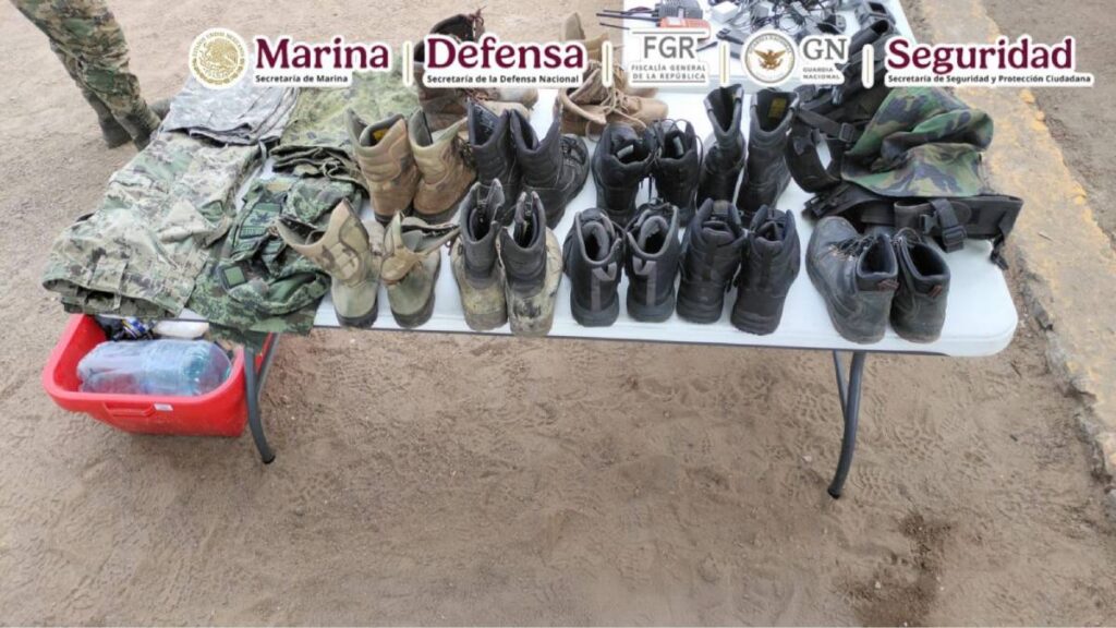 En una segunda acción, las fuerzas federales ubicaron un campamento clandestino, donde se aseguraron vehículos, armas de fuego, municiones, ropa y calzado táctico, además de diverso material relacionado con actividades ilícitas.