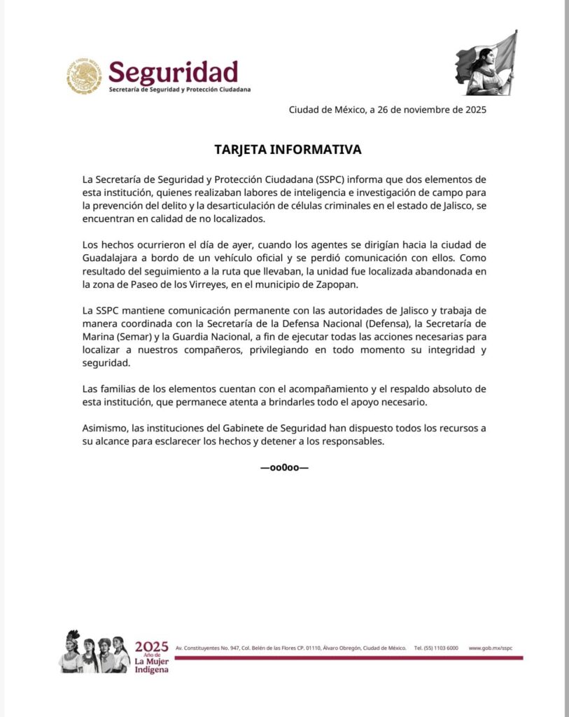 Dos agentes de inteligencia de la Secretaría de Seguridad y Protección Ciudadana (SSPC) se encuentran desaparecidos en Jalisco, luego de perderse comunicación con ellos cuando se dirigían a Guadalajara a bordo de un vehículo oficial, informó la dependencia federal.