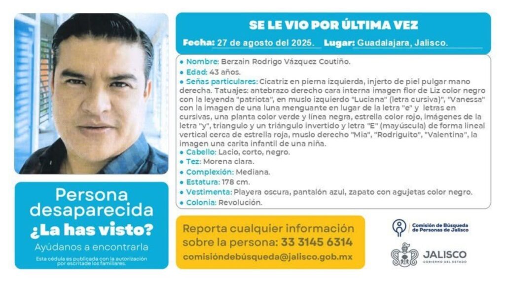 Rodrigo Vázquez Coutiño, de 43 años, tiene como señas particulares una cicatriz en la pierna izquierda, un injerto de piel en el pulgar derecho y varios tatuajes: en el antebrazo derecho porta una flor de Liz en tinta negra con la palabra “Patriota”; en el muslo izquierdo los nombres “Luciana” y “Vanessa”; y en el derecho las inscripciones “Mia”, “Rodriguito”, “Valentina”, junto con el dibujo de un rostro infantil.