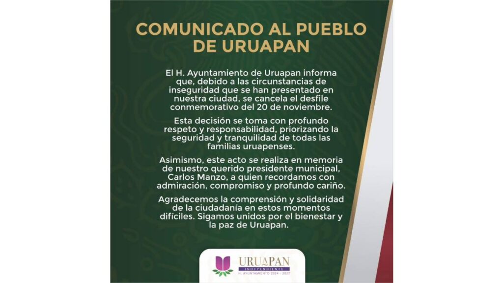 El Ayuntamiento de Uruapan anunció la cancelación del desfile conmemorativo del 20 de noviembre, como medida de respeto y precaución ante los recientes hechos de violencia registrados en la ciudad, entre ellos, el asesinato del alcalde Carlos Manzo Rodríguez.