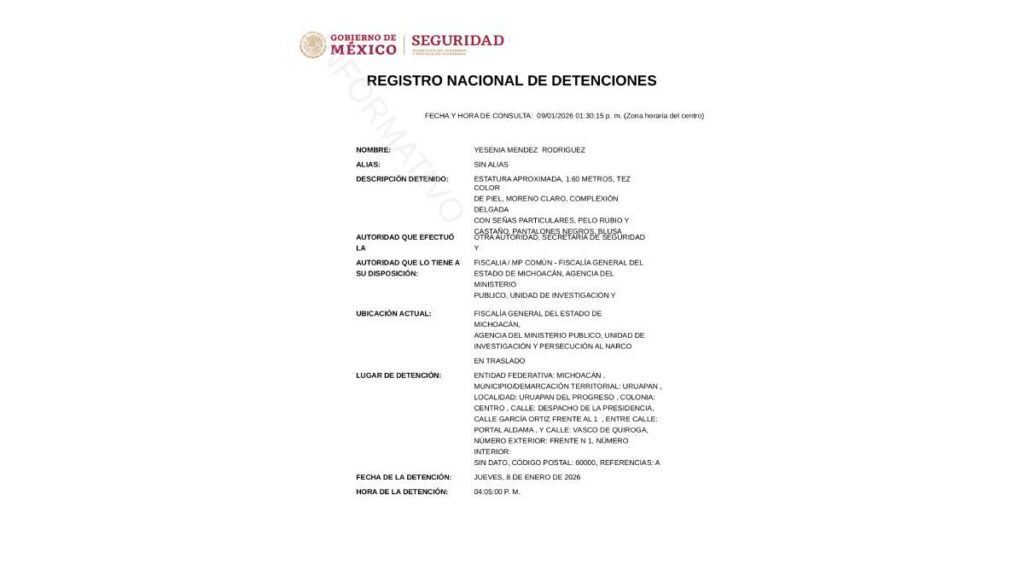 La captura de Yesenia Méndez Rodríguez se llevó a cabo en la Casa de la Cultura de Uruapan, en un operativo encabezado por la Secretaría de Seguridad y Protección Ciudadana (SSPC), con apoyo de instancias estatales. Hasta el momento, ninguna autoridad ha emitido un pronunciamiento oficial sobre los motivos específicos de la detención.