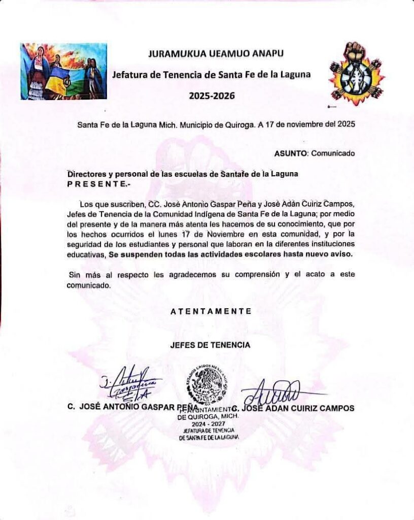 La decisión fue informada a través de una circular dirigida a directores y personal de las escuelas de Santa Fe de la Laguna, firmada por los jefes de Tenencia, José Antonio Gaspar Peña y José Adán Cuiriz Campos.