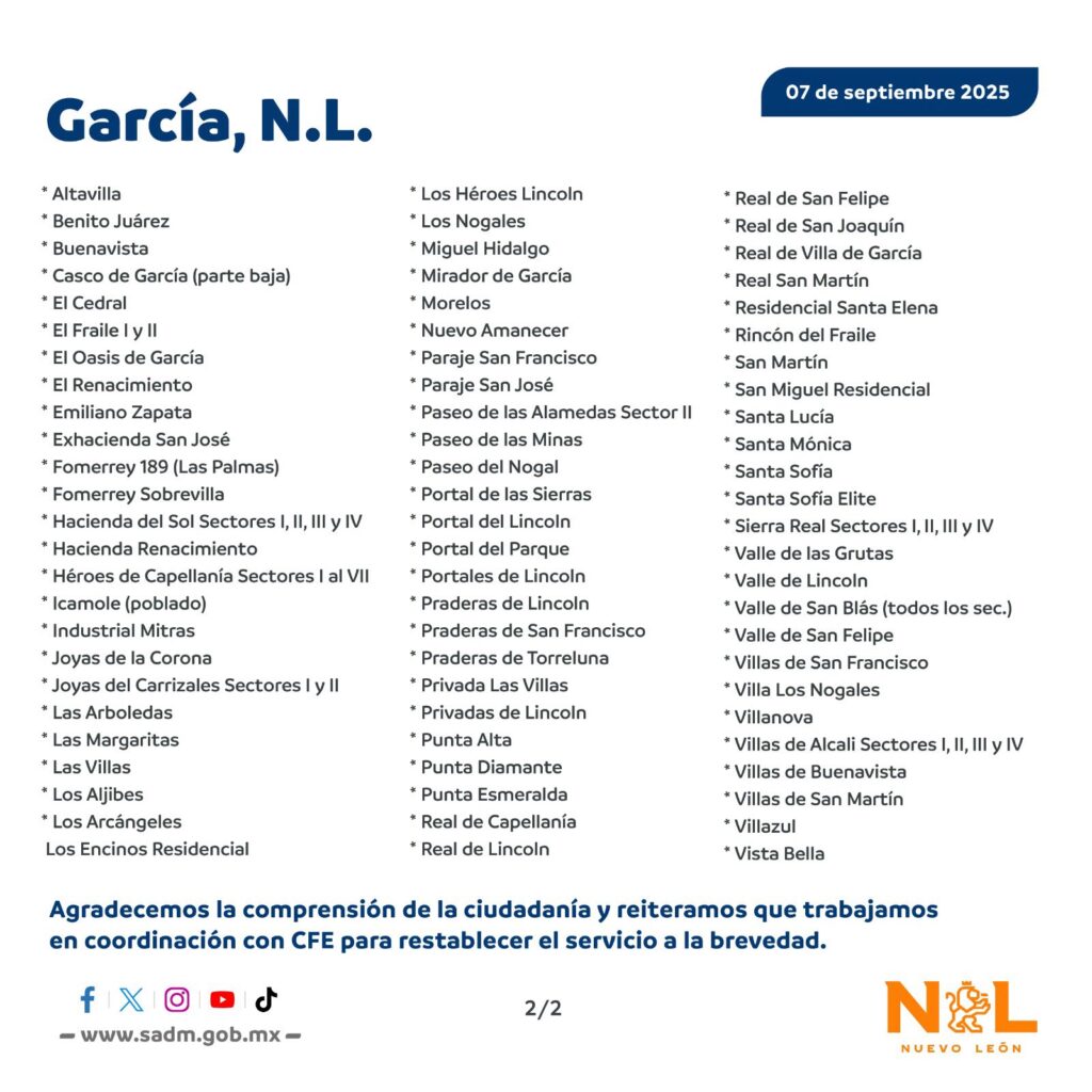 Momentos más tarde, AyD publicó otra ficha informativa, para reportar sobre más fallas en el servicio de agua potable en García, pero en otras 24 colonias, sumando un total de 99.