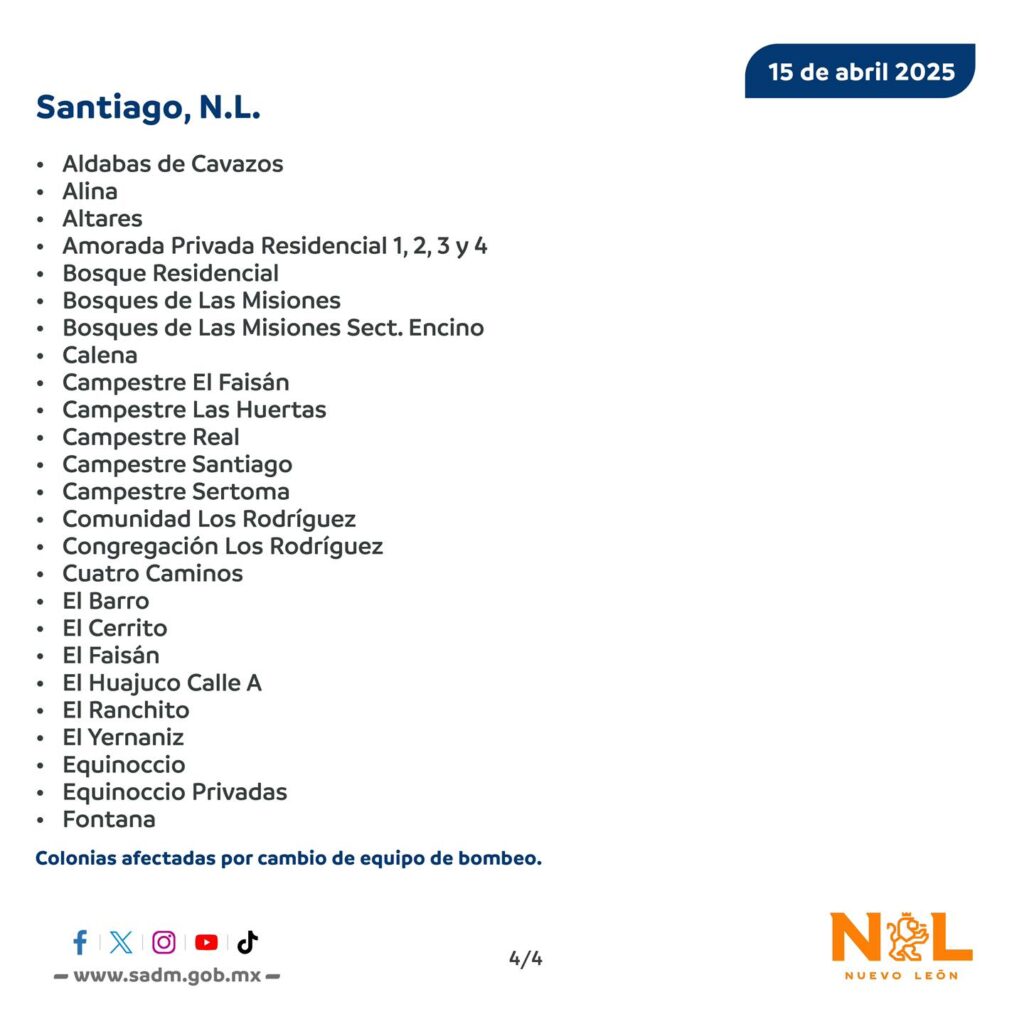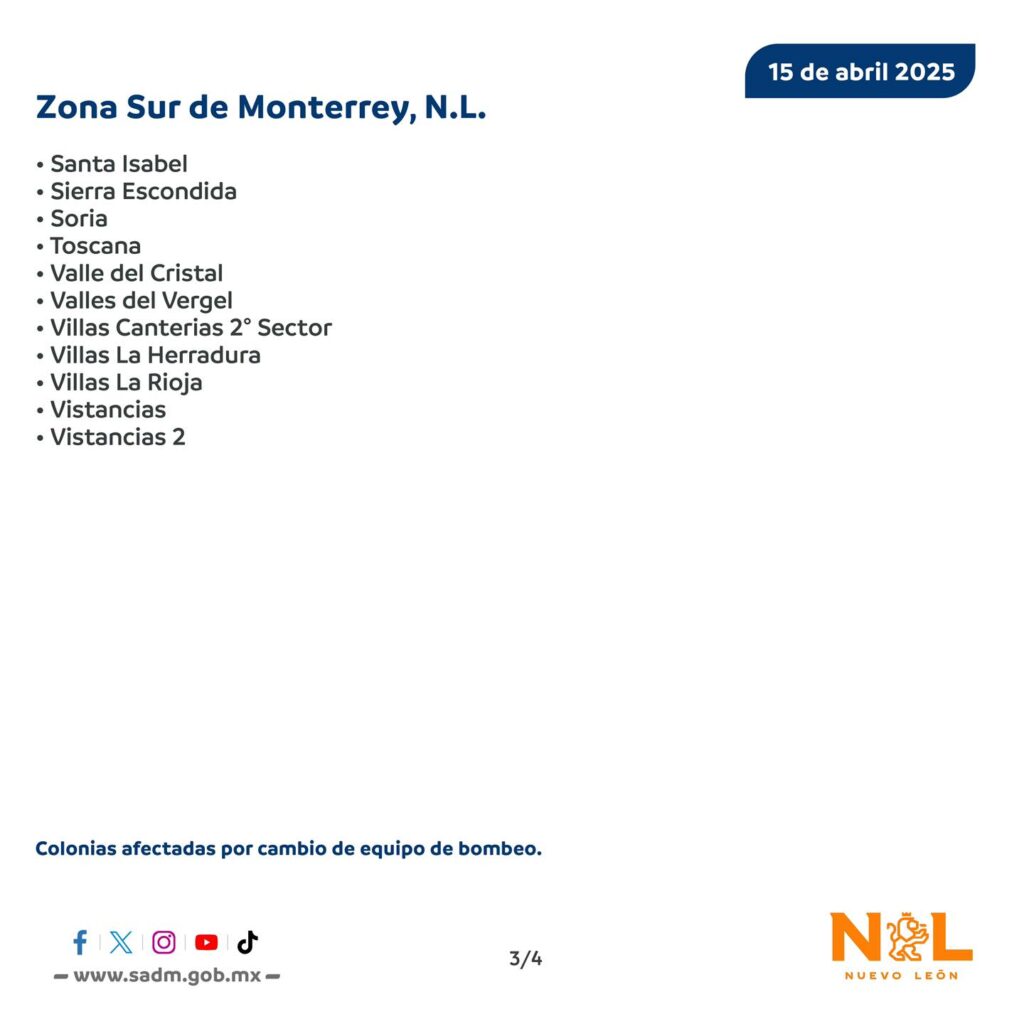 “Durante este periodo, se verá afectado parcialmente el suministro de agua potable en colonias ubicadas entre los límites del sur de Monterrey y el municipio de Santiago, particularmente en el área comprendida a lo largo de la carretera nacional, desde el límite con Monterrey hasta la zona de Los Rodríguez”, publicó Agua y Drenaje en redes sociales.