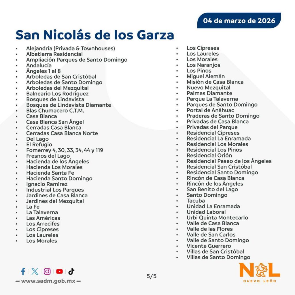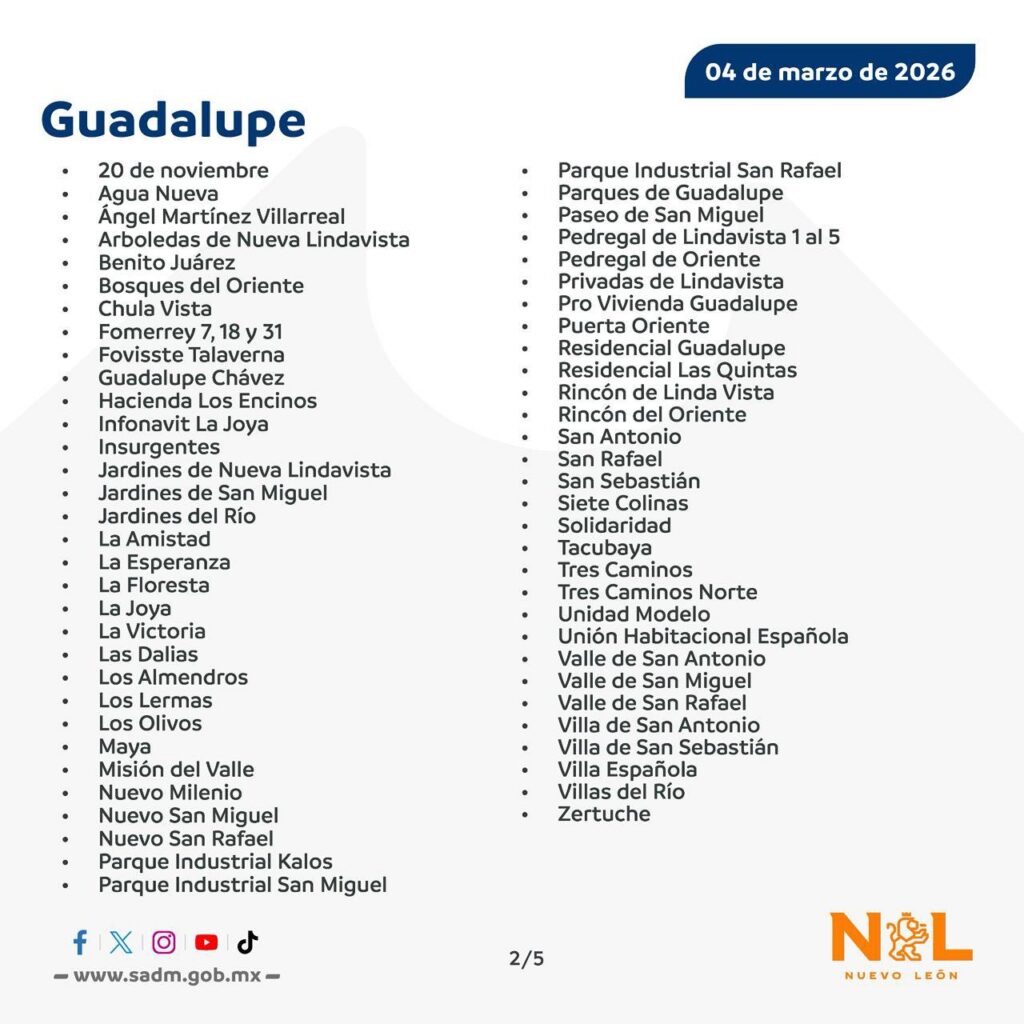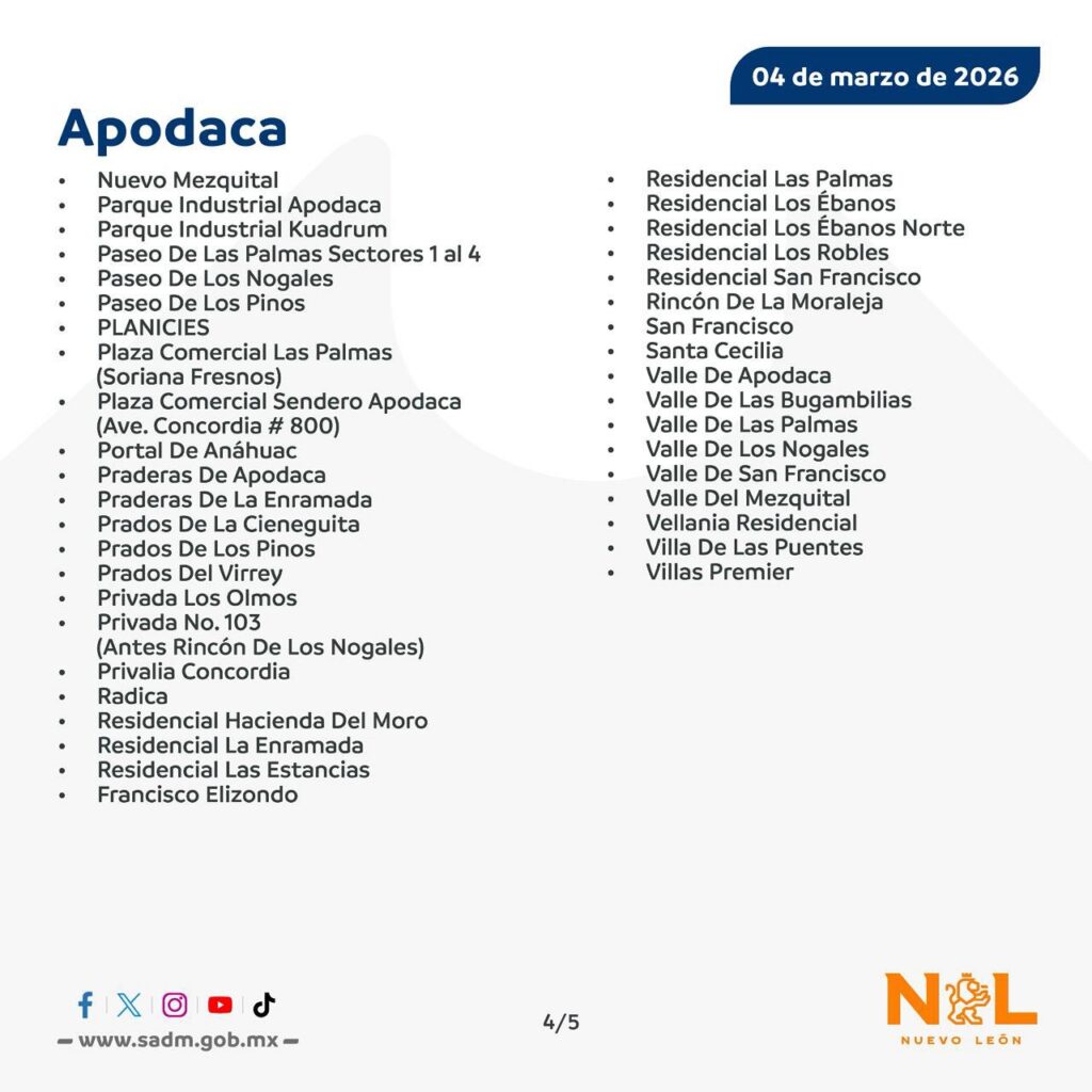 Habrá un megacorte de agua en Nuevo León que afectará a más de 200 colonias ubicadas en tres municipios. Agua y Drenaje de Monterrey (AyD) informó que este jueves 5 de marzo se realizarán obras de mantenimiento, por lo que habrá afectaciones en el servicio.