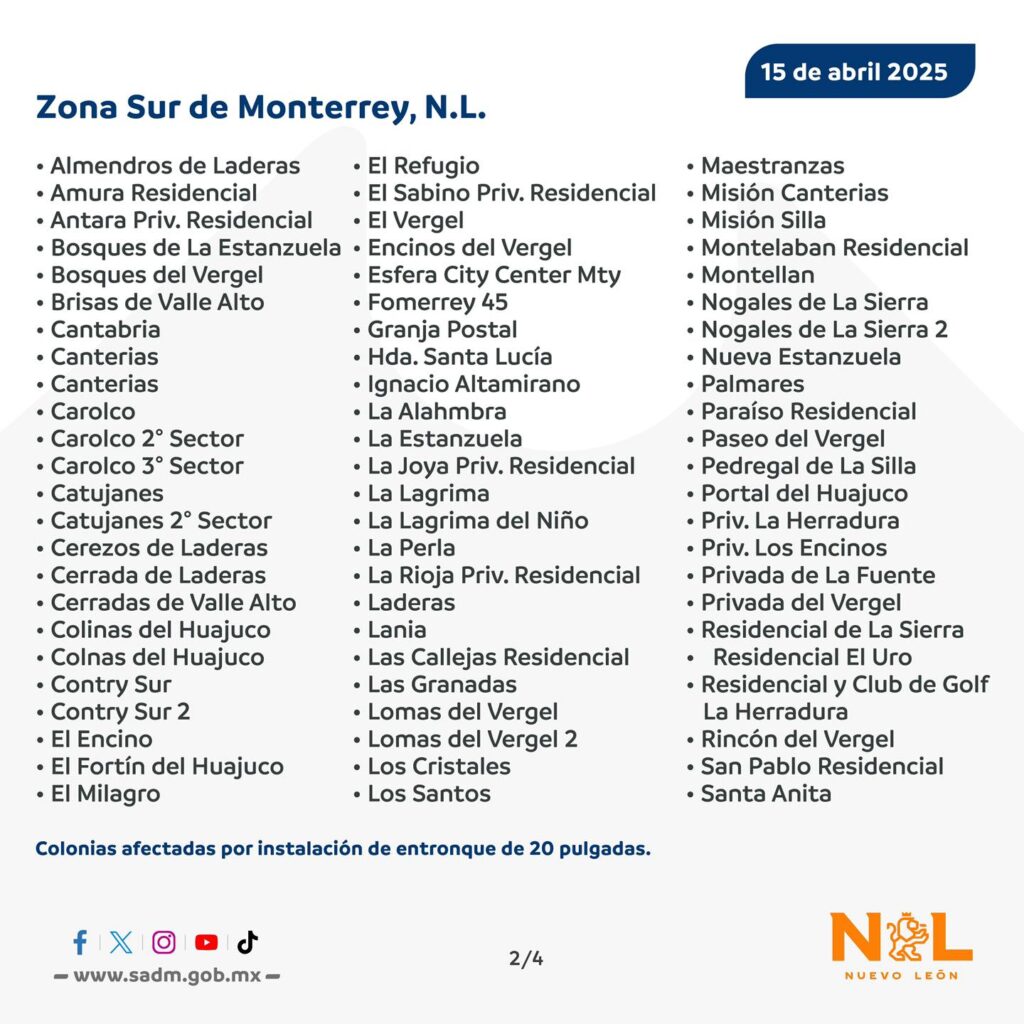 El corte de agua afectará a 107 colonias: 82 del sur de Monterrey y 25 del municipio de Santiago.