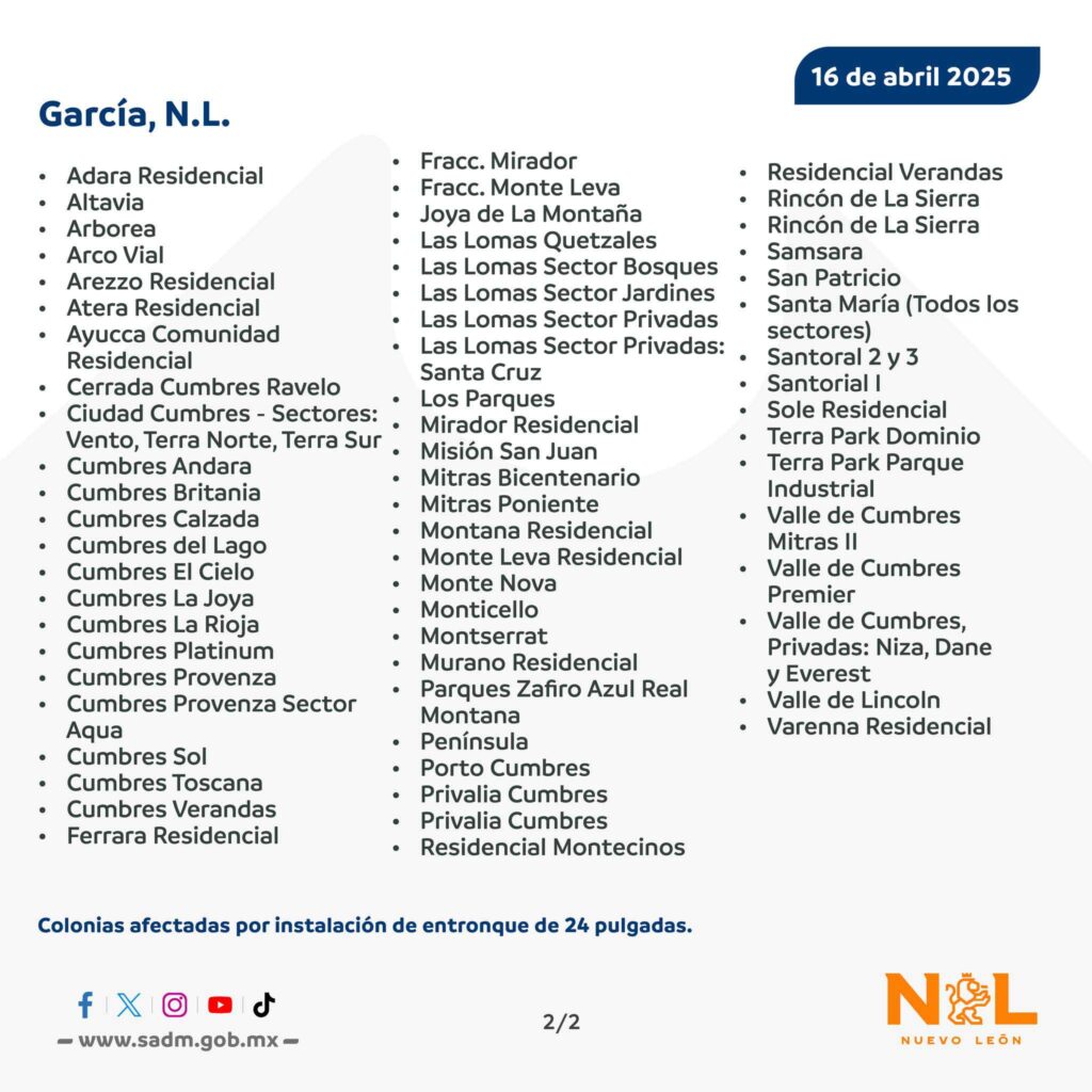 En el municipio de García, Nuevo León, también hay un corte de agua. De acuerdo con la información oficial proporcionada por Agua y Drenaje, el día de hoy se instalará un entronque de 24 pulgadas en el cruce las avenidas Cumbres Madeira y De la Reserva.