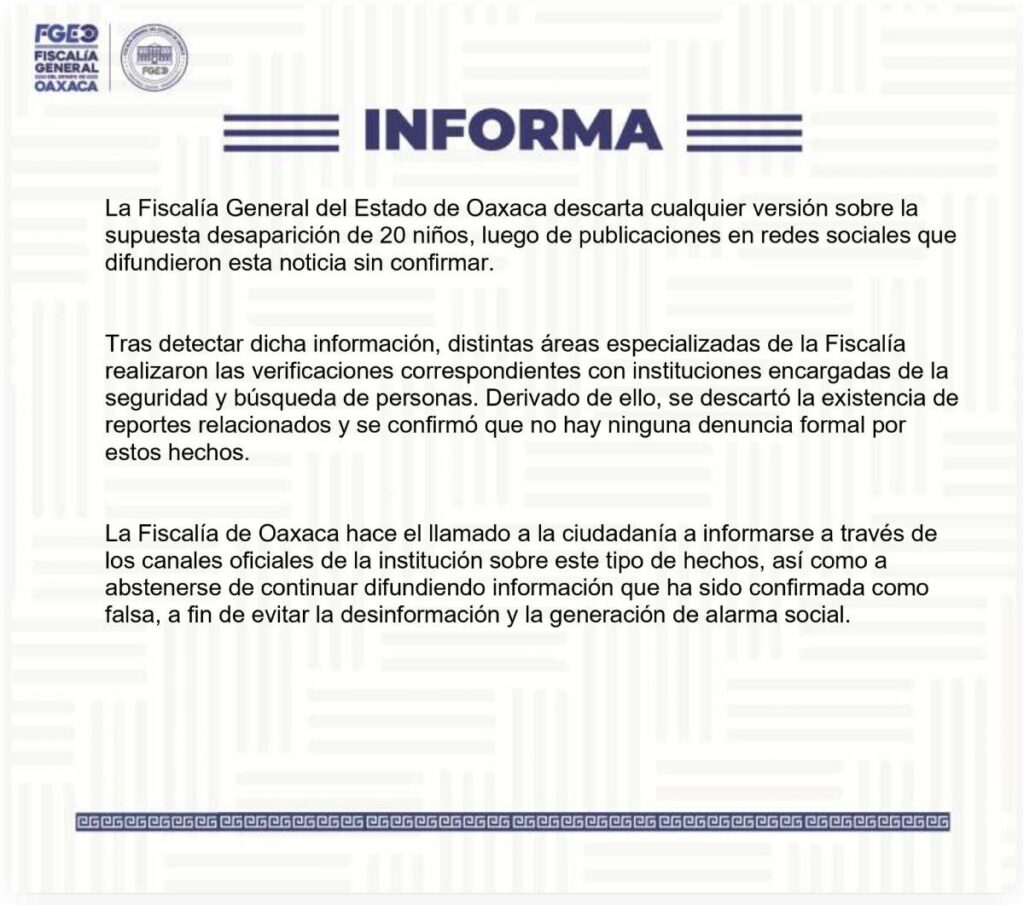 “La Fiscalía General del Estado de Oaxaca descarta cualquier versión sobre la supuesta desaparición de 20 niños, luego de publicaciones en redes sociales que difundieron esta noticia sin confirmar”, se lee en el comunicado.