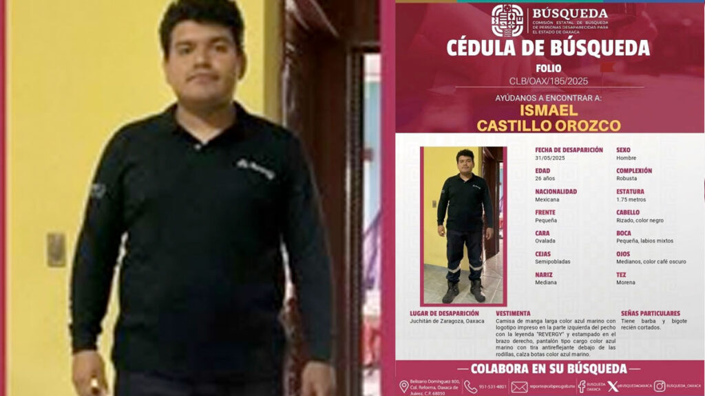 El sábado 31 de mayo, Ismael Castillo Orozco, de 26 años, desapareció en Juchitán, Oaxaca, luego de sufrir un accidente mientras conducía una camioneta de su trabajo. El vehículo cayó en un canal de riego, y aunque en el lugar se hallaron su celular y ropa, hasta ahora no hay rastro de él.
