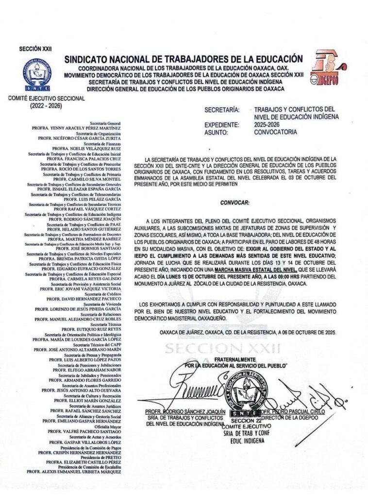 A través de un comunicado, la Secretaría de Trabajos y Conflictos del Nivel de Educación de los Pueblos Originarios de Oaxaca de la Sección XXII del SNTE-CNTE, junto con la Dirección General de Educación de los Pueblos Originarios de Oaxaca (DGEPOO), convocó a los docentes a sumarse a una marcha en defensa de los derechos educativos y laborales del magisterio oaxaqueño.