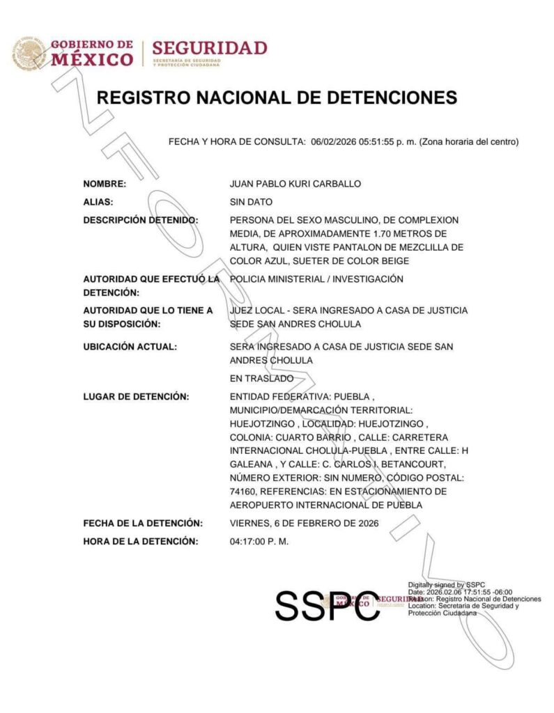 El Registro Nacional de Detenciones (RND) indica que los agentes aseguraron a Juan Pablo Kuri Carballo a las 16:17 horas. Tras su captura, la autoridad lo puso a disposición del juez de control en la Casa de Justicia de San Andrés Cholula, instancia que definirá su situación jurídica.