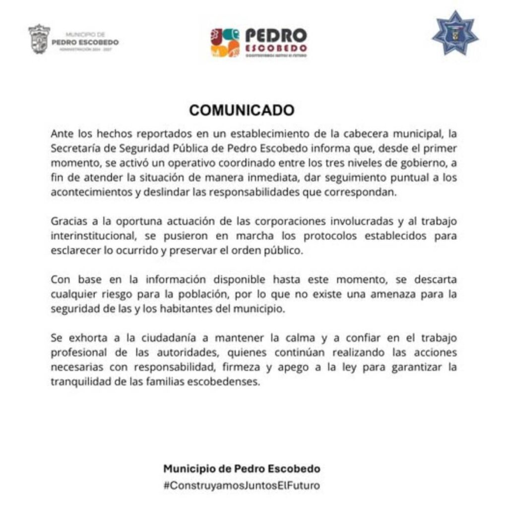 Las autoridades municipales de Pedro Escobedo señalan que por la oportuna actuación de todas las corporaciones de seguridad involucradas en el operativo, así como por el trabajo interinstitucional, se pusieron en marcha los protocolos establecidos para este tipo de reportes y preservar el orden.
