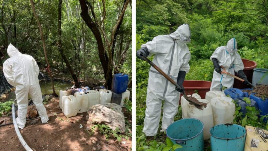 En Sinaloa, autoridades federales y estatales aseguraron seis áreas de almacenamiento de sustancias químicas durante reconocimientos terrestres realizados como parte de la Operación Búsqueda, Localización y Destrucción de Laboratorios Clandestinos.