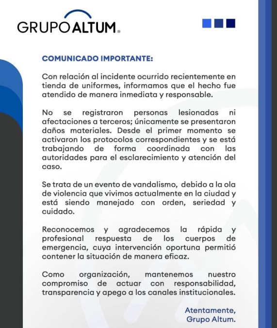 Grupo Altum -conglomerado de empresas en Sinaloa- lamentó los hechos. Indicó que se trató de un acto de vandalismo, “debida la ola de violencia que vivimos actualmente en la ciudad”.