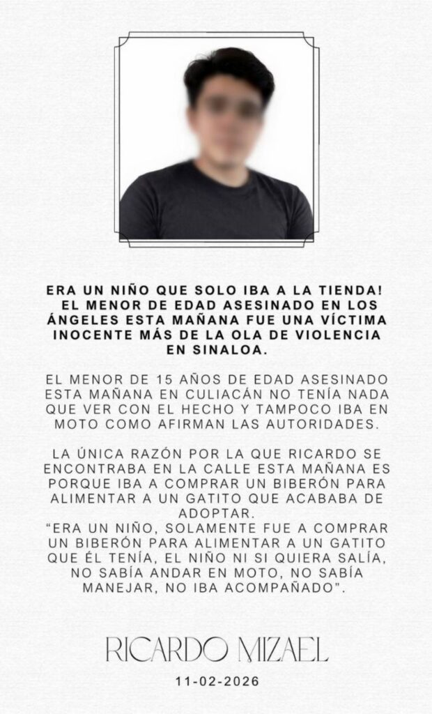 La violencia volvió a impactar la ciudad de Culiacán, Sinaloa, cuando fue asesinado Ricardo Misael, un joven de 15 años que presuntamente fue víctima de una confusión cuando salió de su casa para hacer unas compras.