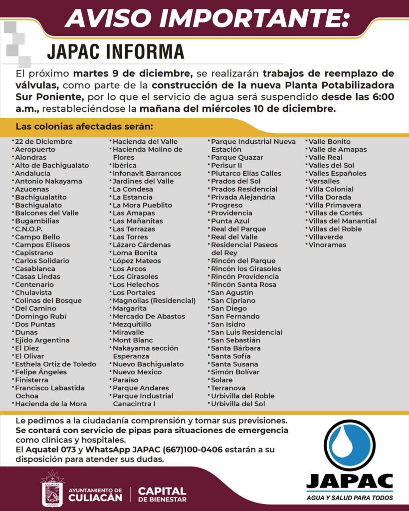 La Japac añade que se contará con el servicio de pipas para situaciones de emergencia, como clínicas y hospitales. Para cualquier duda o aclaración se puede marcar al número Aquatel 073 y al WhatsApp de la Japac (667) 100-0406.
