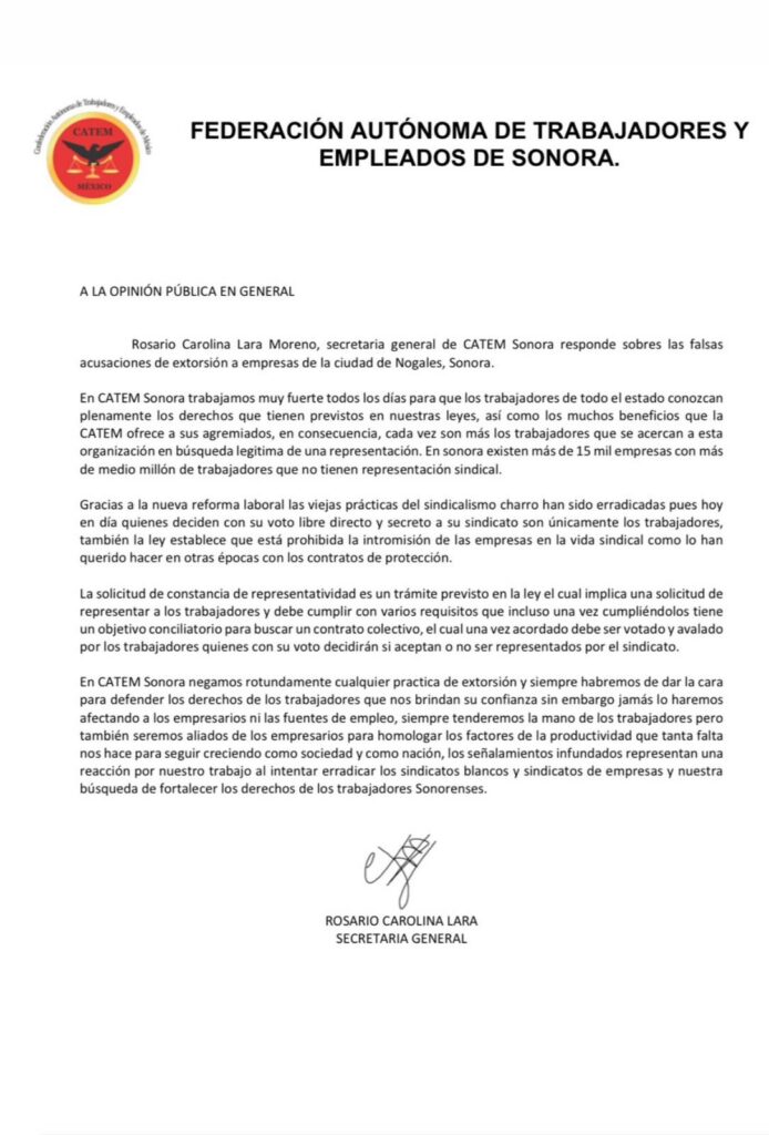 Este lunes 15 de diciembre, tras las acusaciones recientes de algunos empresarios, la Confederación Autónoma de Trabajadores y Empleados de Sonora (CATEM) negó cualquier práctica de extorsión, señalando que siempre apoyarán a los trabajadores. Asimismo, mencionaron que las acusaciones se derivan del intento de erradicar los sindicatos blancos y de empresas.