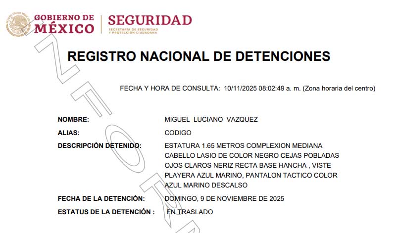 El Registro Nacional de Detenciones señala que la detención de Miguel Luciano “N” ocurrió el domingo 9 de noviembre, mismo día del operativo ya mencionado. El director de la Policía Municipal vestía una playera azul marino y pantalón táctico color azul marino. El reporte no menciona el lugar, ni la hora en que ocurrió la aprehensión.