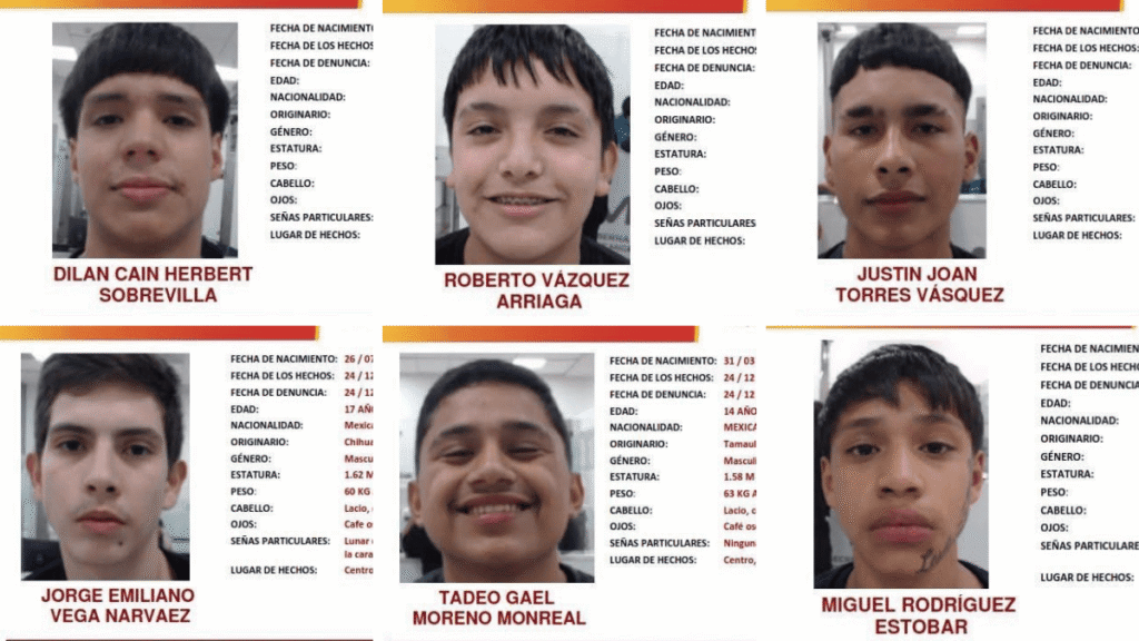Las autoridades del estado señalaron que los adolescentes desaparecidos responden a los nombres de Joan Torres Vásquez, de 17 años; Jorge Emiliano Vega Narváez, de 17 años;Dilan Cain Herbert Sobrevilla, de 16 años; Miguel Rodríguez Estobar, de 16 años; Tadeo Gael Moreno Monreal, de 14 años; y Roberto Vázquez Arriaga, de 14 años.