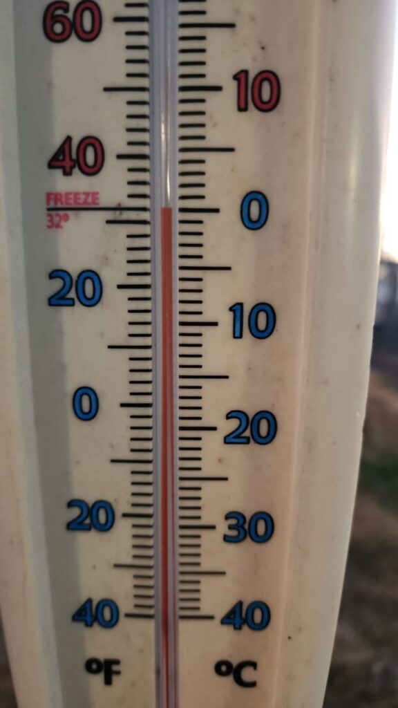 Además, un termómetro instalado en el área rural mostró valores cercanos al punto de congelación, lo que confirmó el descenso de temperatura.