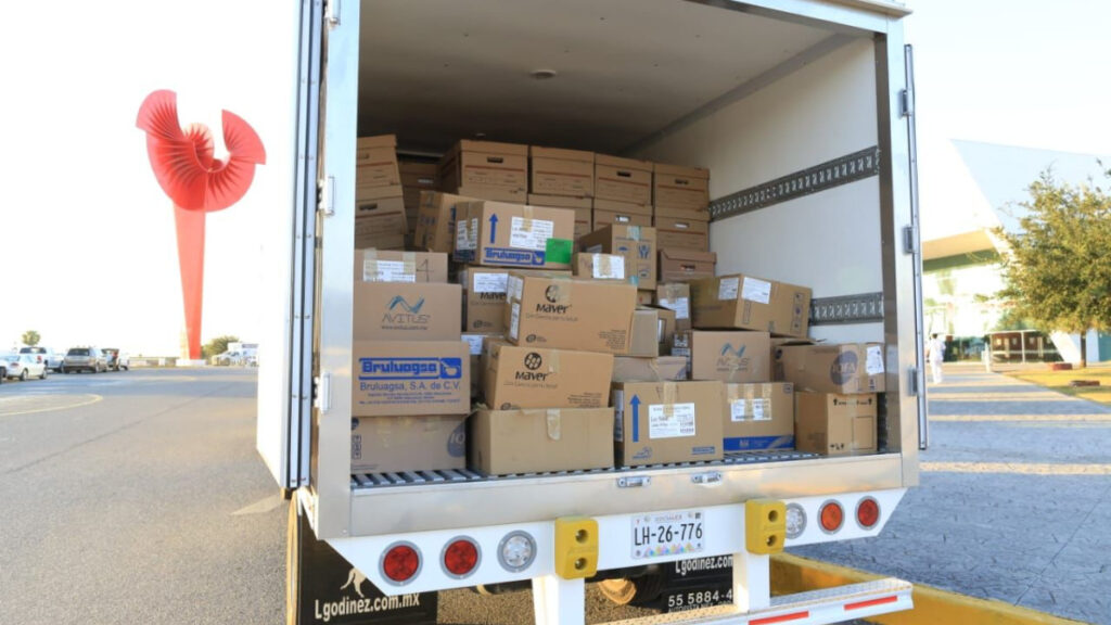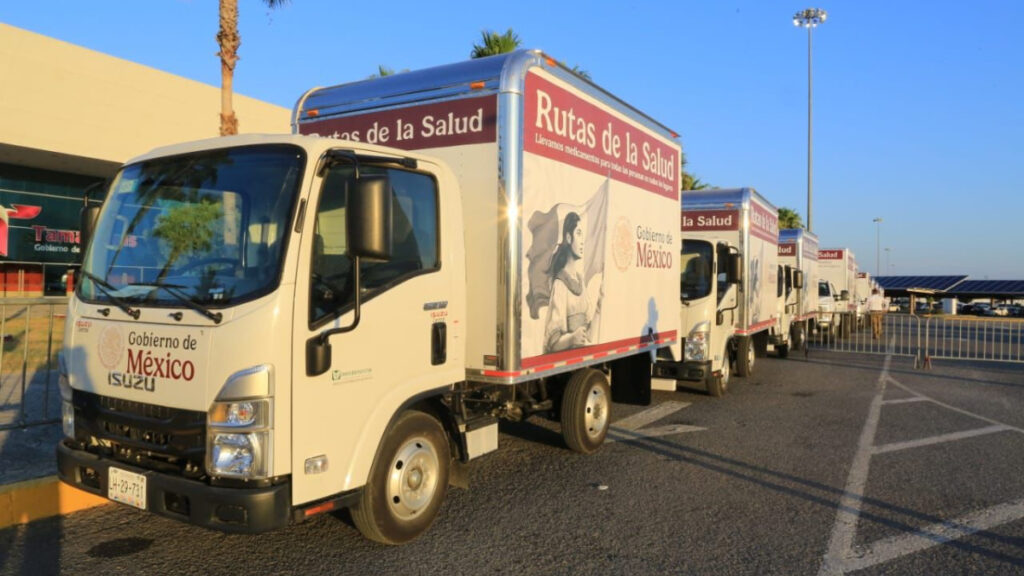 Villarreal Anaya explicó que, con este histórico evento, se ponen en marcha 35 rutas con 15 camiones que transportarán más de 215 mil piezas de medicamentos para su distribución constante y efectiva a 289 centros de salud en el estado.