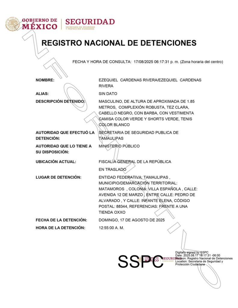Mientras que en el Registro Nacional de Detenciones de la Secretaría de Seguridad y Protección Ciudadana (SSPC), destaca que la aprehensión se llevó a cabo a las 12:55 horas de este domingo en la colonia Villa Española, frente a una tienda Oxxo, siendo presentado ante la Fiscalía General de la República (FGR).