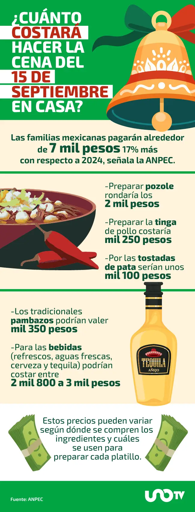 Las familias mexicanas desembolsarán alrededor de 7 mil pesos en promedio para la cena del 15 de septiembre en 2025, según la ANPEC, quien añade que dicho costo es para contemplar el consumo de hasta 10 personas.