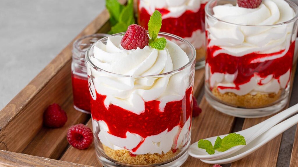 Preparación: Colocar en vasos una capa de galletas triturada casi polvo, encima la mezcla de queso crema con yogurt y miel, y finalizar con frutos rojos. Servir inmediatamente o refrigerar por un par de horas.