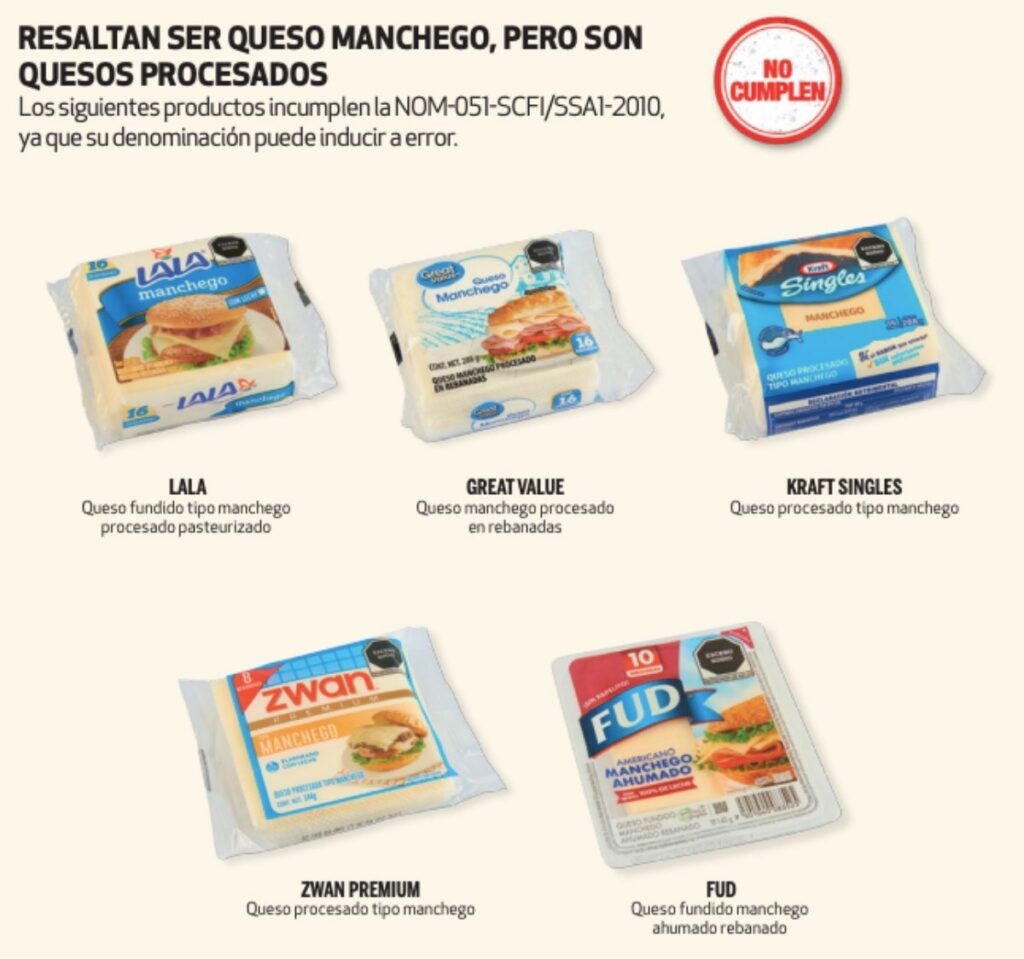 Estos son los cinco quesos que contienen en su etiqueta la palabra “manchego”, pero en realidad son quesos procesados, de acuerdo con Profeco: