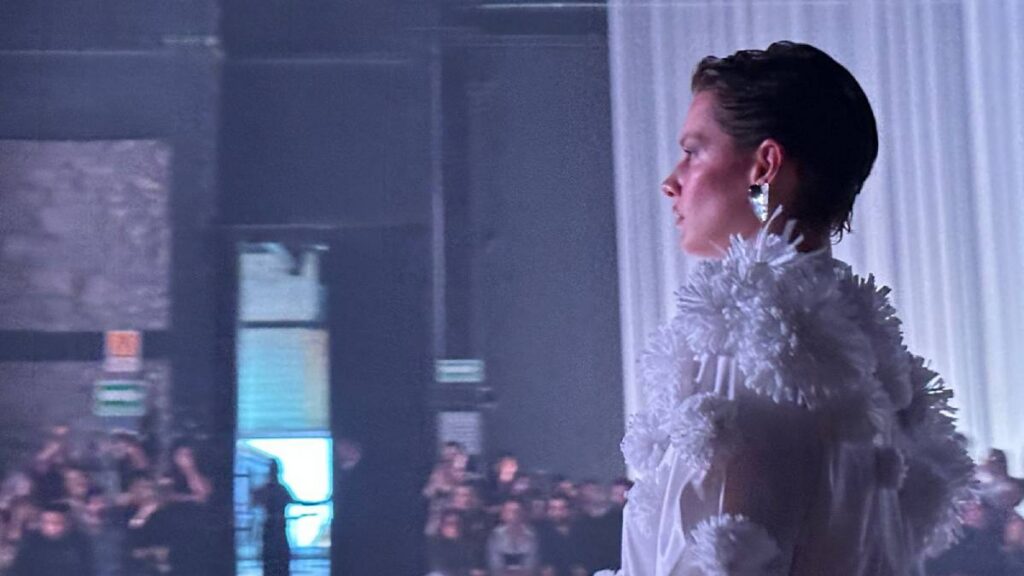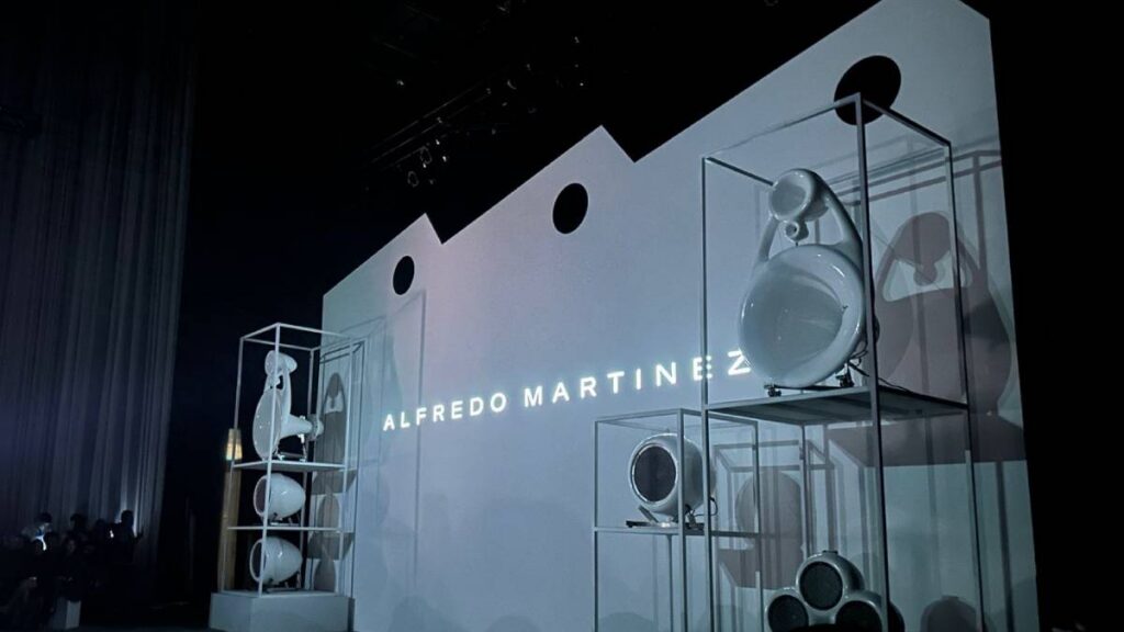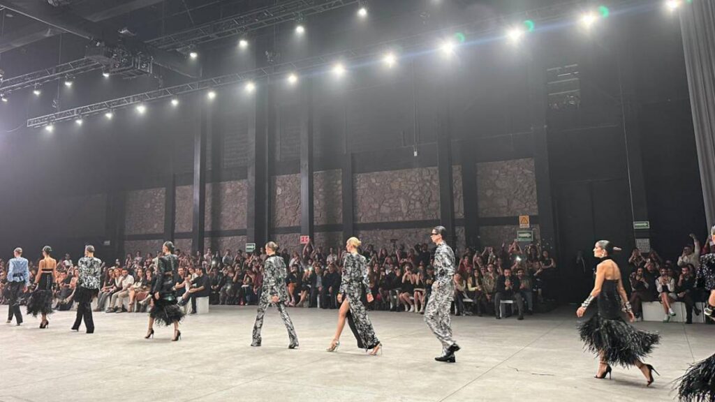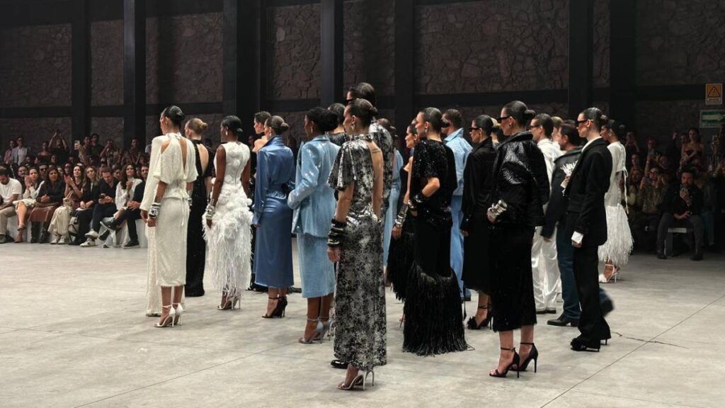 En pasarela, Alfredo Martínez mostró una evolución hacia siluetas más arquitectónicas y potentes, las modelos desfilaron con looks dominados por negros, blancos, plateados y azules metálicos, materiales que reflejaban la luz de forma controlada y precisa.